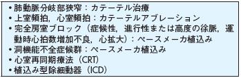 ・肺動脈分岐部狭窄:カテーテル治療 ・上室頻拍,心室頻拍:カテーテルアブレーション ・完全房室ブロック(症候性,進行性または高度の徐脈,運 動時心拍数増加不良,心拡大):ペースメーカ植込み ・洞機能不全症候群:ペースメーカ植込み ・心室再同期療法(CRT) ・植込み型除細動器(ICD)